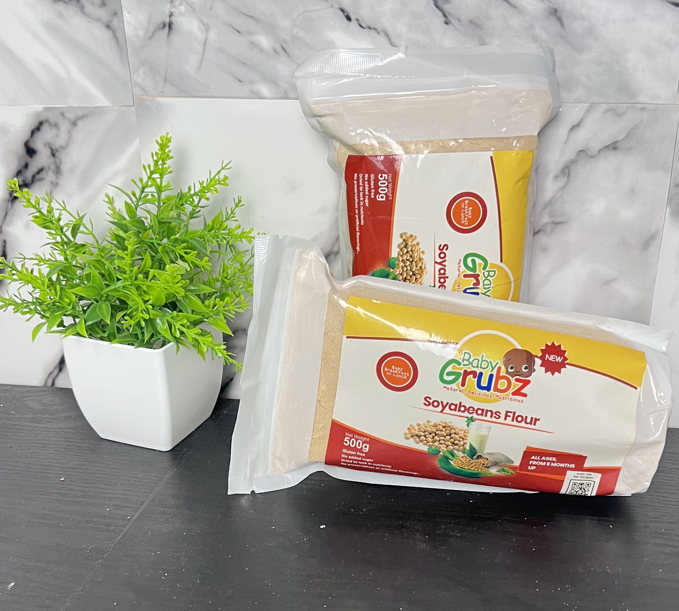 | Made from finely milled, dehulled soybeans. BabyGrubz Soyabeans Flour is a rich source of plant based protein, calcium, and iron. Ideal for boosting the nutritional content of infant cereals, pap, or pancake batters.